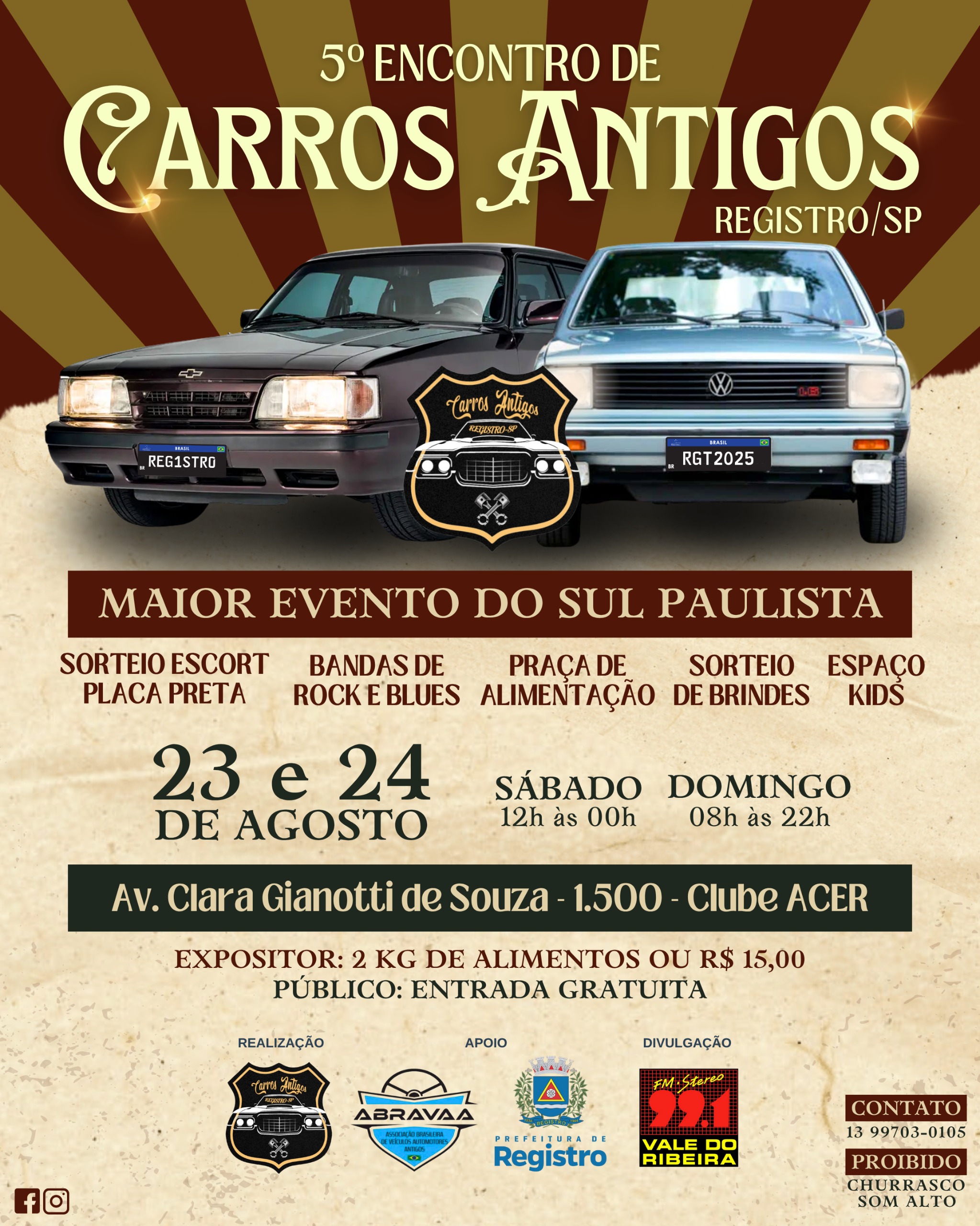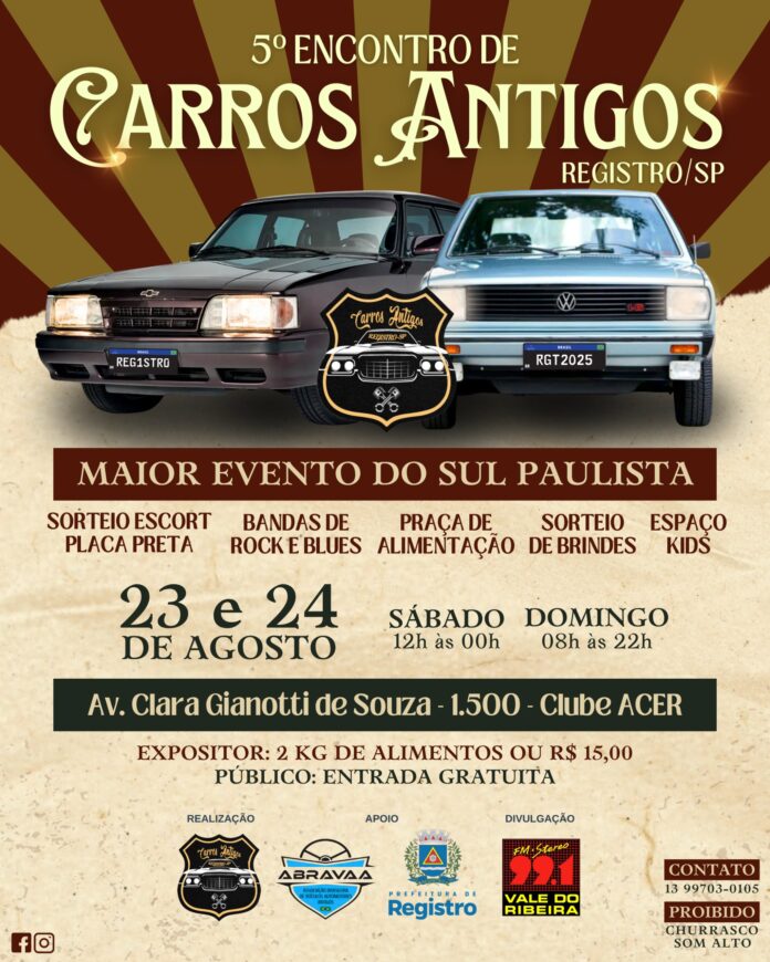 REGISTRO – A cidade de Registro recebe neste sábado (23) e domingo (24) o 5º Encontro de Carros Antigos, considerado o maior evento do gênero no Sul Paulista. Realizado pelo Clube de Carros Antigos de Registro, com apoio da Prefeitura de Registro e da Abravaa, o encontro já é tradição e promete reunir colecionadores, clubes de várias cidades como a Baixada Santista, Grande São Paulo e Paraná, e famílias em busca de lazer, cultura e entretenimento. A cada edição, o evento cresce em público e impacto econômico, movimentando o turismo e setores como hospedagem, alimentação, comércio, postos de combustíveis e serviços automotivos. A programação inclui shows ao vivo com as bandas Audiophone, Hub, James, Marcos Machado em Banda e Vintage Pack, além de praça de alimentação, espaço kids, feira de antiguidades e artesanato da Feira da Lua. Outro destaque será a premiação em diversas categorias e sorteios de brindes. O momento mais esperado ocorre no domingo (24), às 15h, com o sorteio de um Ford Escort 1988, placa preta, iniciativa que torna o encontro de Registro um dos poucos do Brasil a oferecer prêmio de tamanho porte. A entrada para pedestres é gratuita. Expositores de veículos podem participar com a entrega de 2kg de alimentos não perecíveis ou taxa de R$ 15,00. Todos os alimentos arrecadados serão destinados a entidades assistenciais do município, reforçando o caráter social do evento. O 5º Encontro de Carros Antigos de Registro conta com a parceria da Rádio 99 FM Vale do Ribeira e acontece no Clube ACER (antigo RBBC), na Avenida Clara Gianotti de Souza, 1.500. no sábado (23), o horário será das 12h à meia-noite; no domingo (24), das 8h às 22h.
